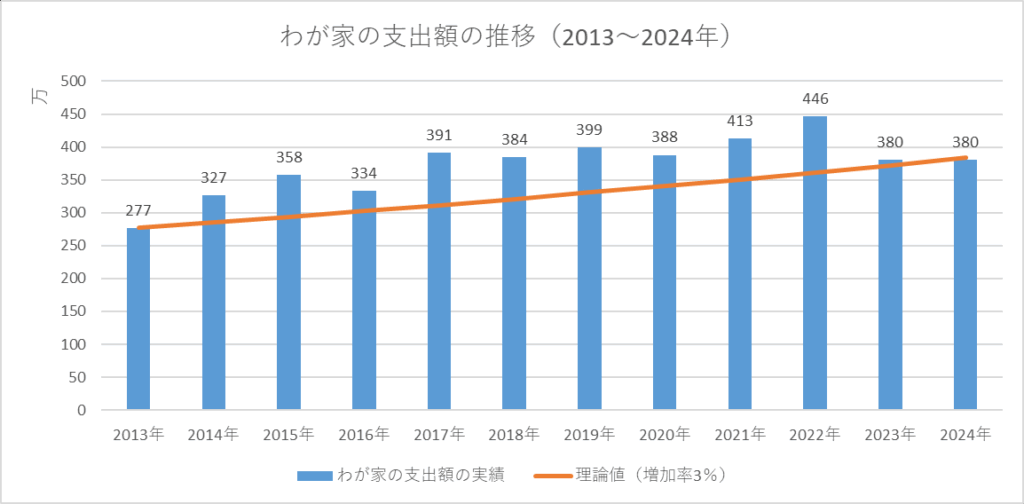 実際のわが家の支出推移を見ても、この「昨年比3%増」という設定は大きく外れていません。(下のグラフは、2013年から2024年までのわが家の支出の推移です。)